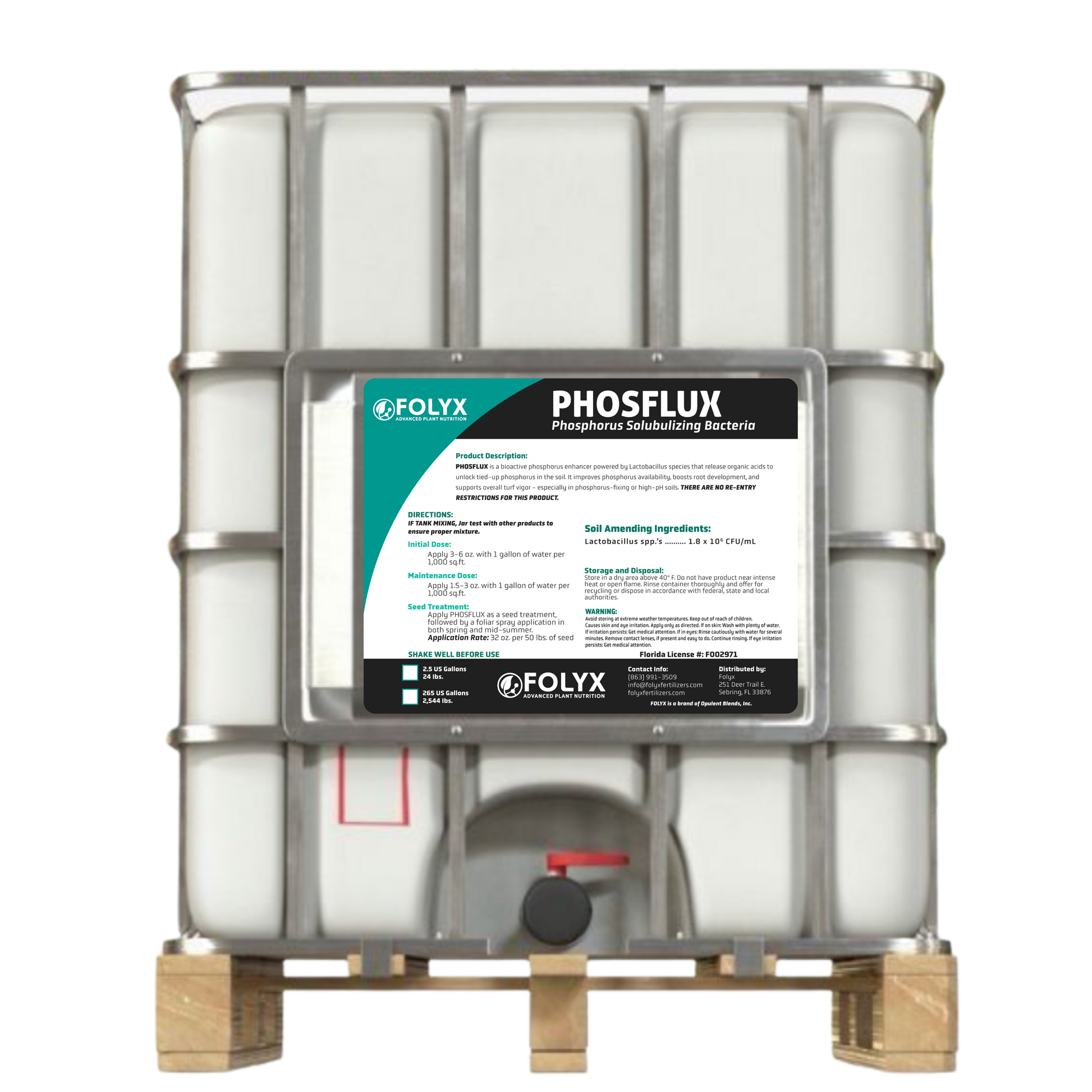 PHOSFLUX is a bioactive phosphorus enhancer powered by Lactobacillus species that release organic acids to unlock tied-up phosphorus in the soil. It improves phosphorus availability, boosts root development, and supports overall turf vigor - especially in phosphorus-fixing or high-pH soils. THERE ARE NO RE-ENTRY RESTRICTIONS FOR THIS PRODUCT.